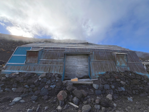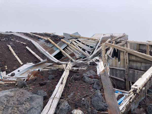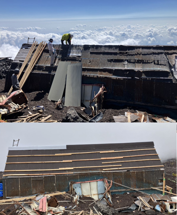 ふじあざみ(旧・日の出館)の現状 クラファンにも掲載されている通り、暴風雨で屋根が飛び、落石で屋根や壁に大穴が空き、砂礫に押されて柱が傾き、、、 建物はとても修繕できる状態ではなく、このままでは倒壊して登山道に倒れ込んでしまう恐れもあります 危険な状態の建物は解体し、新たに建て直すしかありません |