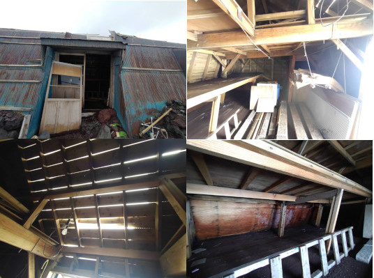 朝日館を応急修理 これ以上の劣化を避けるため、大工さんの手を借りて屋根を修繕しました 残されていた残留物は整理し、再利用できないものはゴミとして運び出しました 朝日館はふじあざみの再生工事に、とても役に立つ事でしょう |