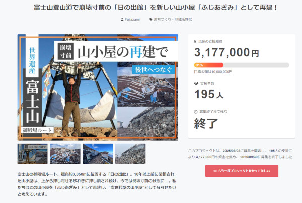 再生への路 「日の出館」を、時代の流れに合わせた新しい山小屋「ふじあざみ」としてリニューアルオープンするべく、諸方面への働きかけと同時にたくさんの賛同や応援をいただけるように邁進してまいります 富士山登山道で崩壊寸前の「日の出館」を新しい山小屋「ふじあざみ」として再建! クラファンは2025年9月30日で終了しました、ご支援ありがとうございました ・支援総額 3,177,000円 ・支援者数 195人 |